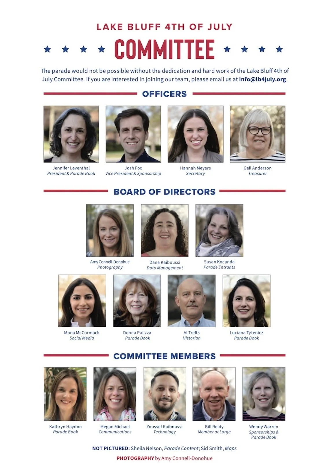 The Annual Lake Bluff Parade is produced by the all-volunteer Lake Bluff 4th of July Committee since 1911. Our Committee is a 501(c)(3) not-for-profit organization. All gifts are tax deductible to the extent provided by law. Planning and running the parade is no small feat and there is always a need for more volunteers. Parade committee members participate in monthly meetings, make decisions about the parade and lend expertise in areas of knowledge or interest. Committee roles include treasury, finance, sponsorship, information technology, parade content, book production, communications and social media, VIP management and logistics. Our planning process starts in September and relies on the welcome assistance of fifty additional dedicated volunteers and strong support from the Village Board, Police Department, Public Works as well as our partners. We hold meetings monthly, but it's not all work and no play. We savor the efforts of our partners at the Firemen's Ball and the Kiwanis Club's Pancake Breakfast.
